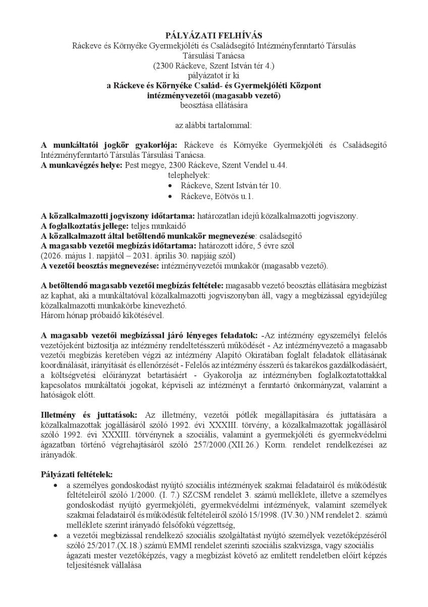 Pályázati felhívás – Ráckeve és Környéke Család- és Gyermekjóléti Központ intézményvezető