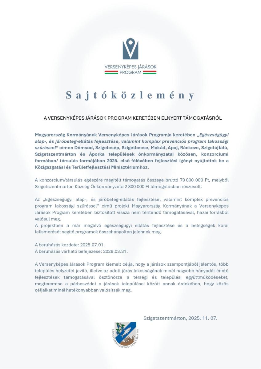 Sajtóközlemény - Egészségügyi alap-, és járóbeteg-ellátás fejlesztése, valamint komplex prevenciós program lakossági szűréssel