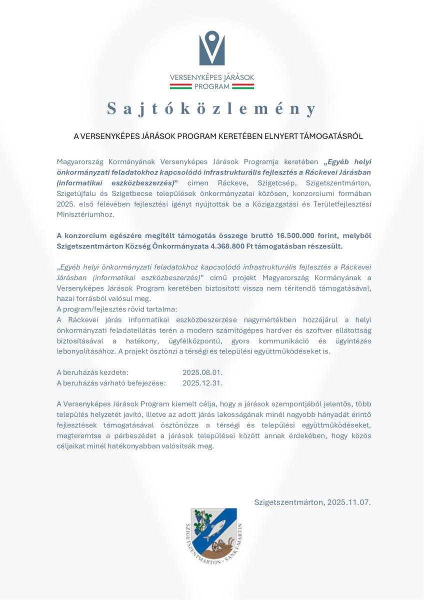 Sajtóközlemény - Egyéb helyi önkormányzati feladatokhoz kapcsolódó infrastrukturális fejlesztés a Ráckevei Járásban (informatikai eszközbeszerzés)